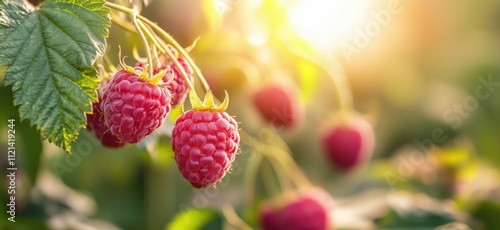 Ripe raspberries hanging on vine, sunlight illuminating fruit, lush green leaves, soft focus background, summer harvest, copy space for text