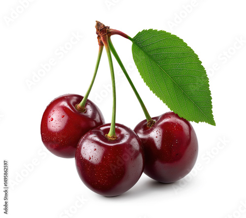 cherry, fruit, red, ripe, fresh, sweet, juicy, natural, healthy, organic, dessert, tasty, delicious, raw, snack, tropical, stem, leaf, seed, vitamin, nourishment, antioxidant, dew, freshness, plant, summer, harvest, agriculture, ingredient, food, isolated, white, background, closeup, macro, detail, glossy, shiny, vibrant, edible, botany, garden, berry, single, studio