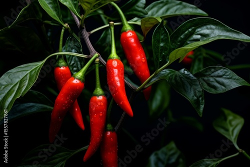 chili, red, pepper, background, dark, green, tree branch, colourful, up, spice, plant, food, hot, growing, black, nature, healthy, ripe, agriculture, shiny, water, cookery, droplet, vibrant, diet, nourishment, vegetable, natural, ingredient, spicey, culinary, close, favor, produce, farm, leaf, eating, garden, fresh, organic, aroma, taste, scent, detail, macro, stem, contrast, juicy, wet