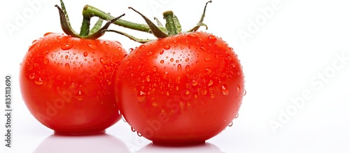 Ripe red mini cherry tomato with water drops, isolated on a white background, presenting a vibrant copy space image.