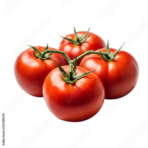 Ripe tomatoes with bright red skin lying on a flat surface, showcasing their smooth texture and vibrant color, isolated on white background