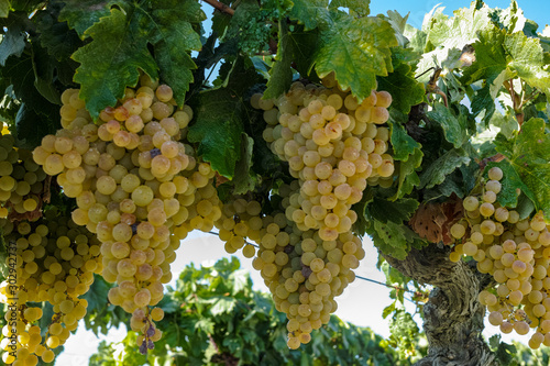 Ripe white grape growing in vineyard in Andalusia, Spain, sweet pedro ximenez or muscat, or palomino grape ready to harvest, used for production of jerez, sherry sweet and dry wines