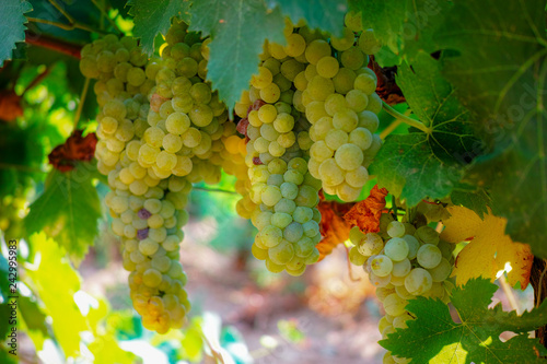 Ripe white wine grapes plants on vineyard in France, white ripe muscat grape new harvest