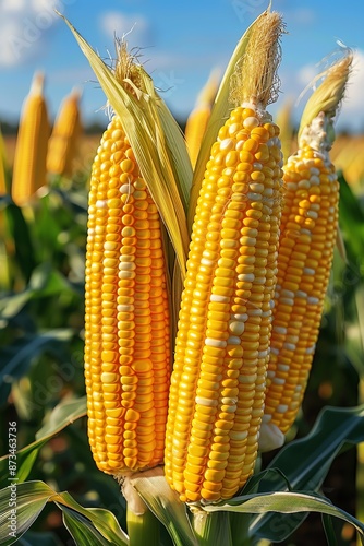 Ripe yellow corn cobs growing in a green, sunlit field with blue sky