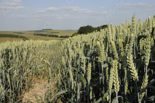 Ripening wheat crop (Tricticum aestivum) with the Ridgeway in the background, Marlborough Downs, Wiltshire
