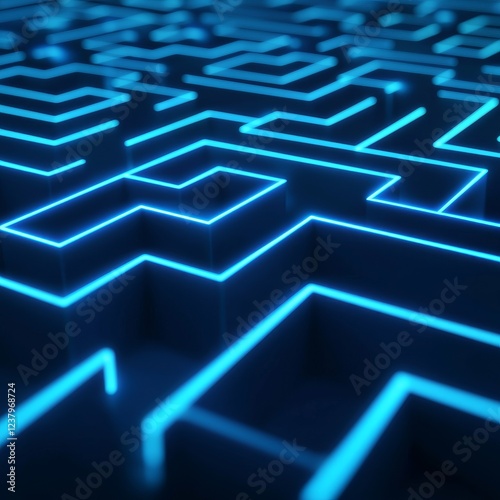 Risk challenge forecast concept. 3D maze with glowing blue neon lines on a dark background.