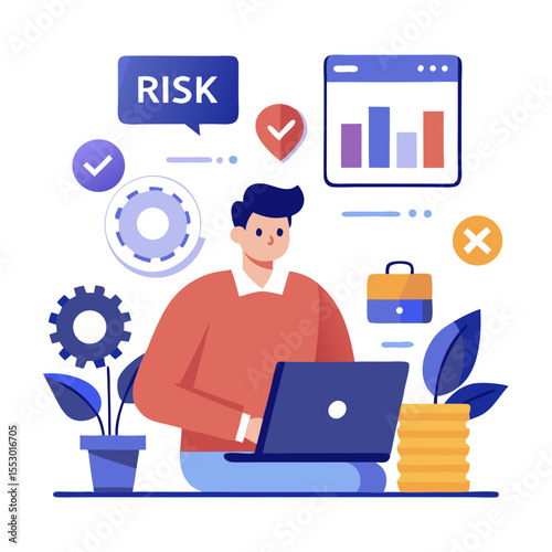 Risk management concept Risk assessment Person using laptop to business and personal planning for risk mitigation with information and decision modern flat design simple vector illustration isolated