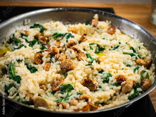 risotto, rice, cooking, spinach, champignon, mushroom, broth, pan, pot, butter, italian, food, edible, frying, chinese, preparing, dinner, vine, roasted, antipasto, fast food, asian, thai, meal, cooked, plate, dish, fast, kitchen, cookery, fried, lunch, gastronomy, spoon, eatery, roast, vegetable, vegetable, white, poultry, background, chicken