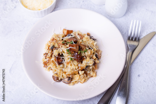 Risotto with porcini mushrooms. Traditional Italian dish. Close-up, horizontal orientation.