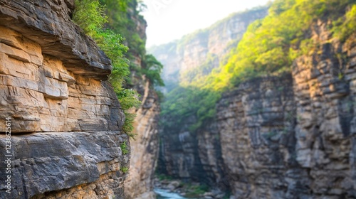 River canyon nature idea. Scenic canyon with towering cliffs and lush greenery under soft morning light.