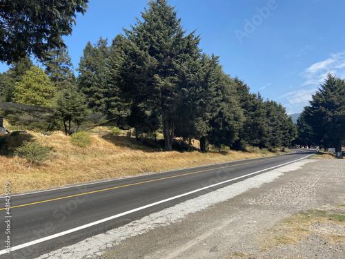 road, sky, landscape, highway, asphalt, travel, tree, nature, tree, way, rural, summer, forest, street, curve, country, green, trip, countryside, cloud, mountain, car, lane, line, transportation