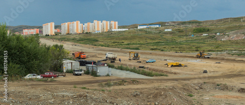 Road construction. Newly built apartment buildings. Construction site. New residential area. Urbanization. Ust-Kamenogorsk (kazakhstan)