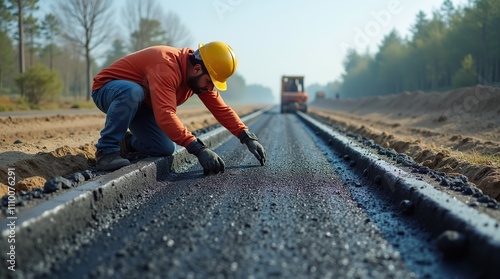 Road Construction Worker Ensures Smooth Tarmac Surface at Site