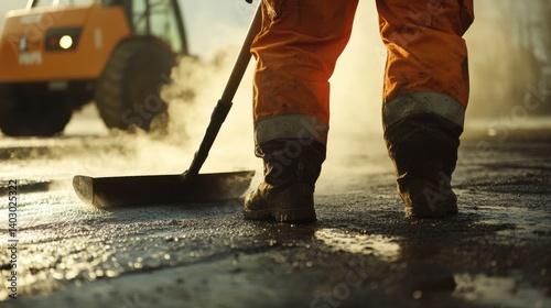 Road construction worker smoothing hot asphalt. Featuring craftsmanship and durability