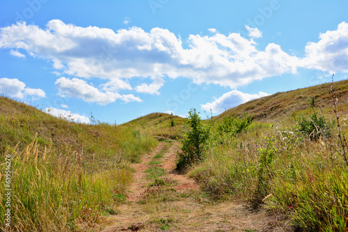 road going up the hill with blue sky and white clouds in sunny day