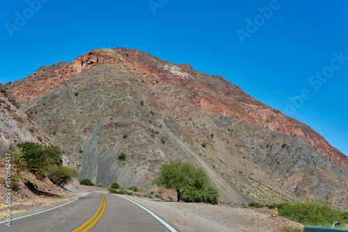 road heading towards a rocky mountain with a blue sky in the background in Salta, Argentina.
