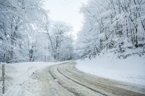 Road in Sabaduri forest with covered snow. Winter time