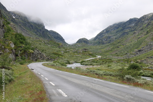 road, mountain, landscape, sky, travel, highway, asphalt, nature, mountain, summer, cloud, way, view, scenery, hill, drive, green, vale, grass, curve, tree, car, country, route, journey, norge