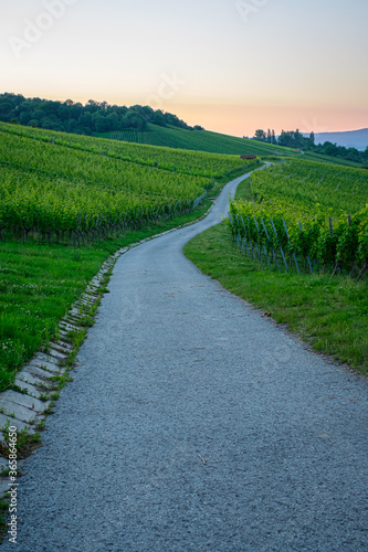 Road in vineyard in morning dawn