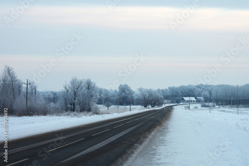 Road infrastructure. Panoramic view of the winter highway going away in the distance among the picturesque frosted trees and huts in the distance. Copy space.