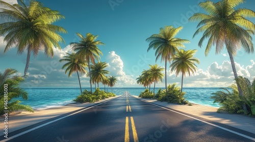 Road lined in Palm Trees,coastal boulevard lined with tall palms on the beach,Beach paradise,Summer beach vibes,Holliday road trip by vehicle.