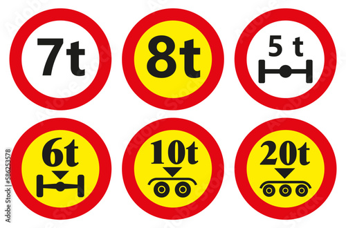 signs, road, icon, truck, vector, traffic, restriction, prohibited, logotype, caution, ban, red, rule, no, danger, zone, forbidden, vehicle, passage, alert, security, set, pictogram, illustration, symbol, poster, safety, path, attention, disallow, warning, background, control, risk, display, circle