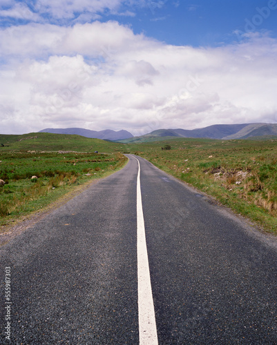 highway, road, direction, center, transportation, daytime, line, row, structure, cloudy, bend, curve, middle, paved, image, lining, european, overcast, place, picture, photograph, align, lineup, irish, britain, ireland, nobody, mountain chain, travel, range, perspective, country road, mountain, color image, dividing line, connemara, open road, inline, color photography, bb