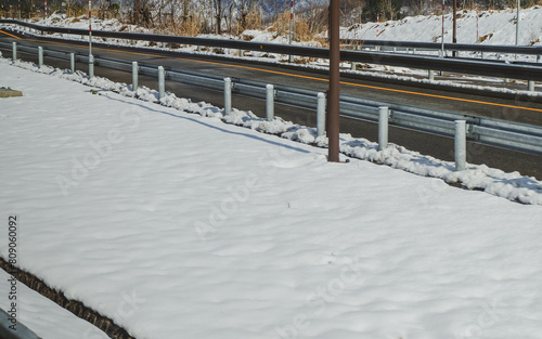 Road through the countryside in the winter season. Snow and mountains visible.