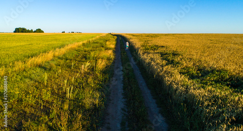road, field, landscape, sky, nature, grass, summer, green, rural, path, countryside, agriculture, meadow, blue, country, spring, tree, yellow, cloud, land, horizon, cloud, way, sun, season, man, people