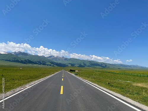 road, mountain, landscape, travel, highway, sky, asphalt, nature, mountain, summer, journey, way, cloud, empty, drive, hill, country, car, view, line, transportation, grass, street, snow, scenery