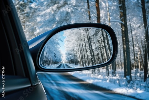 Road trip with car in winter. Winter seasonal concept.