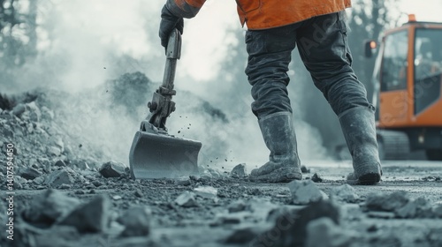 Road worker using a jackhammer to break up concrete pavement. Featuring strength and technique