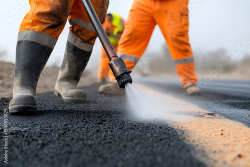 roadwork, construction, maintenance, asphalt, safety, men at work, equipment, infrastructure, transportation, boot, public works, teamwork, workplace, engineering, material, urban, street, cleaning, daytime, grey, manpower, project, ground, site, labor, municipal, community, spray, hose, application, weather, repair, machinery, industry