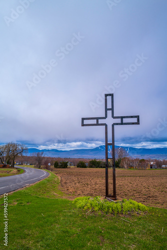 quebec, rural scene, springtime, outdoors, land, no people, single object, plain, sky, calmness, day, hill, photo, farm, up high, cross, crossing, cross section, signs, road, roadside, journey, roadsign, road trip, botany, metal, symbol, mountain, mountain peak, ski resort, curve, dividing, brown, cross