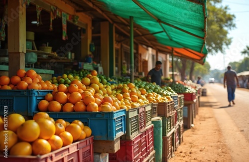 Roadside fruit stand South Africa. Variety fresh fruits vegetables on display. Oranges, limes, lemons, tomatoes. Local business, shop with natural organic produce. Healthy food, travel, tourism.