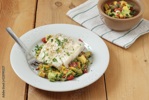 avocado, roasted, dinner, salsa, cod, cucumber, delicious, food, fresh, mango, meal, oven, plate, tasty, tomatoes, fork