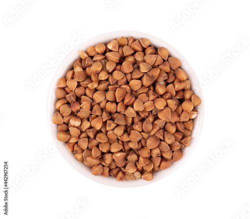 Roasted buckwheat grains in bowl, isolated on white background. Dry brown buckwheat groats. Top view.