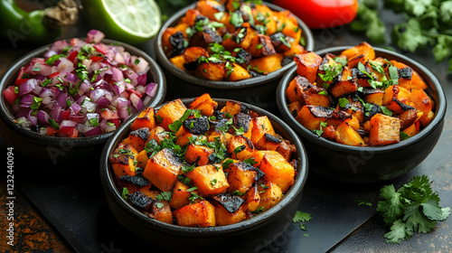 Roasted Butternut Squash with Fresh Herbs in Bowls with Salsa on Dark Background