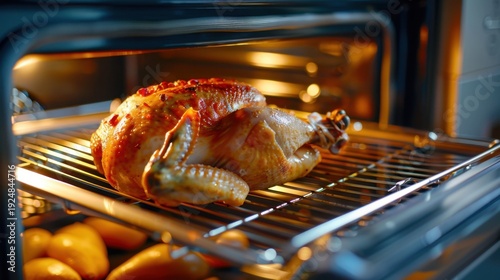 Roasted Chicken Cooking in Oven with Golden Skin and Aromatic Herbs Presenting a Delicious Meal Scene