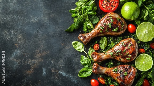 chicken, roasted, herb, vegetable, tomatoes, lime, greener, dark, background, food, arrangement, display, preparation, ingredient, healthy, cookery, dish, receipe, top, view, close, up, delicious, tasty, flavorful, appetising, summer, dinner, meal, organic, fresh, produce, alimentary, protein, seasoning, spice, brown, red, green, natural, rustic, plate, plated, side