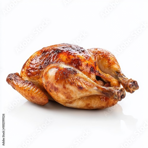 Roasted chicken isolated on a white background, showcasing its crispy skin and juicy meat.