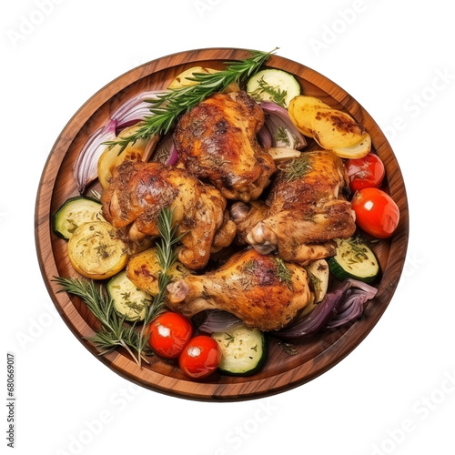 Roasted chicken on wooden plate isolated on transparent background, Grilled seasoned rotisserie chicken dish garnish menu, above, top view, cooking, recipe, holiday turkey. Generative AI