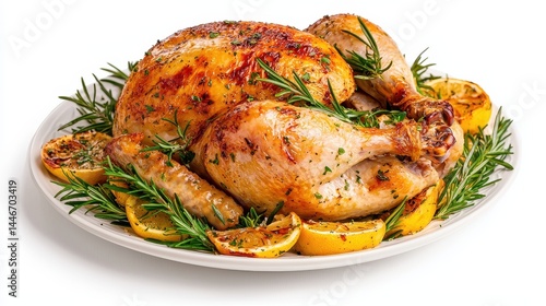 lemon, rosemary, herb, food, meal, dinner, cookery, delicious, tasty, appetising, epicure, plate, white background, culinary, gastronomy, receipe, cooking, home cooking, comfort food, thanksgiving, christmas, main course, protein, poultry, citrous, white plate, food photography, hi-res, studio shot, closeup, health food
