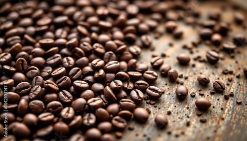 Roasted Coffee Beans on Rustic Wood Surface