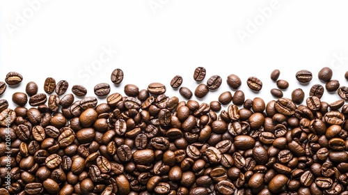 Roasted coffee beans scattered on white background.