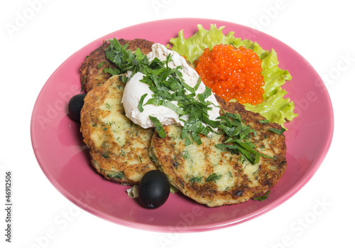 Roasted cutlets of potato with salmon on a plate