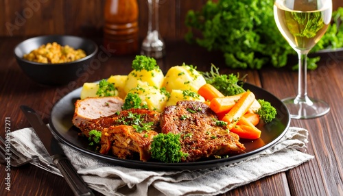 Roasted Pork with Potatoes, and Carrots Dinner.