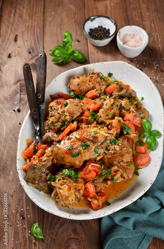 food, rabbit, meat, stew, baked, carrot, ragout, onion, tomatoes, braised, fried, leg, wine, sauce, hare, cooked, delicious, diet, dinner, dish, eat, epicure, gravy, grilled, healthy, herb, leaf, organic, prepared, receipe, roast, rustic, sour, stewed, table, vegetable, wooden, plate, portion, meal, oven, lunch, catering