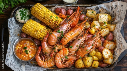shrimp, potato, corn, roasted, platter, food, kitchen, dinner, seafood, receipe, meal, delicious, healthy, summer, grill, baking, cooking, eat, tasty, fresh, organic, spicey, sauce, side, dish, tray, prepare, home, epicure, eatery, lunch, party, holiday, family, friends, gathering, seasoning, favor, image, photo, stock