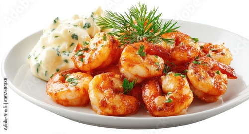 shrimp, roasted, cooked, seafood, meal, dish, plate, white, sauce, creamy, dill, garnish, dinner, food, delicious, appetising, tasty, healthy, protein, cookery, eatery, epicure, fresh, lunch, side, side dish, savoury, image, isolated, closeup